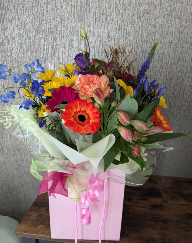 A cheerful bright gift bouquet,full of warm vibrant blooms.